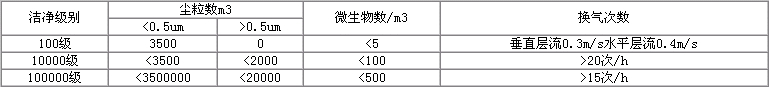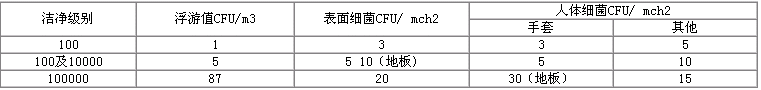 對(duì)不同潔凈級(jí)別的潔凈室,細(xì)菌的允許值如表三所示: